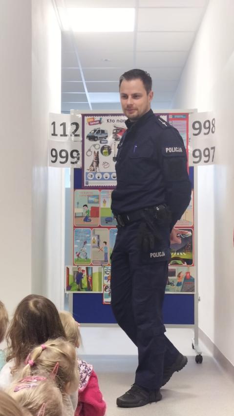 Właśnie dlatego w ramach ogólnopolskiej akcji „Bezpieczne Ferie 2026” nasze przedszkole odwiedzili policjanci: aspirant sztabowy Marek Popowicz i młodszy aspirant Wojciech Rzeźnik, którzy w przystępny sposób opowiedzieli między innymi o zasadach poruszania się po drogach zimą, unikaniu kontaktów z nieznajomymi, numerze alarmowym 112. Odpowiedzieli również na pytania dlaczego lód na stawie jest zdradliwy i gdzie szukać bezpiecznych lodowisk, jak bezpiecznie zjeżdżać na sankach z dala od ulicy oraz dlatego warto nosić odblaski.